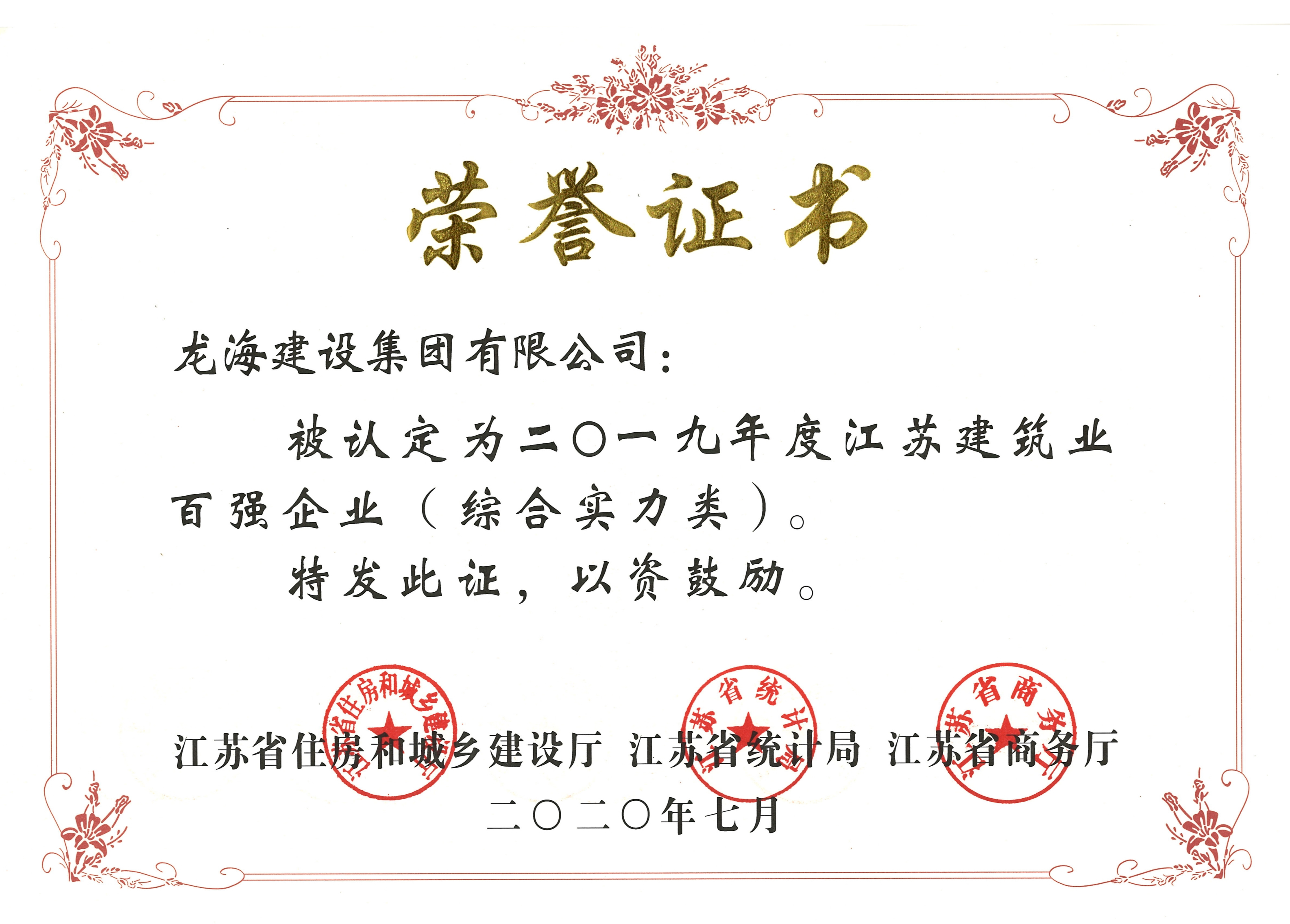 為表揚先進,宣傳典型,進一步激發(fā)和調(diào)動我省建筑業(yè)企業(yè)改革創(chuàng)新、轉(zhuǎn)型發(fā)展的積極性、主動性和創(chuàng)造性,擦亮“江蘇建造”高品質(zhì)發(fā)展品牌,省住建廳與省統(tǒng)計局、省商務廳聯(lián)合開展了2019年度建筑業(yè)“百強企業(yè)”認定活動。經(jīng)評審,集團公司脫穎而出,被授予“2019年度江蘇省建筑業(yè)百強企業(yè)(綜合實力類)”榮譽稱號,位列第三十位,公司已連續(xù)多年獲此殊榮。
